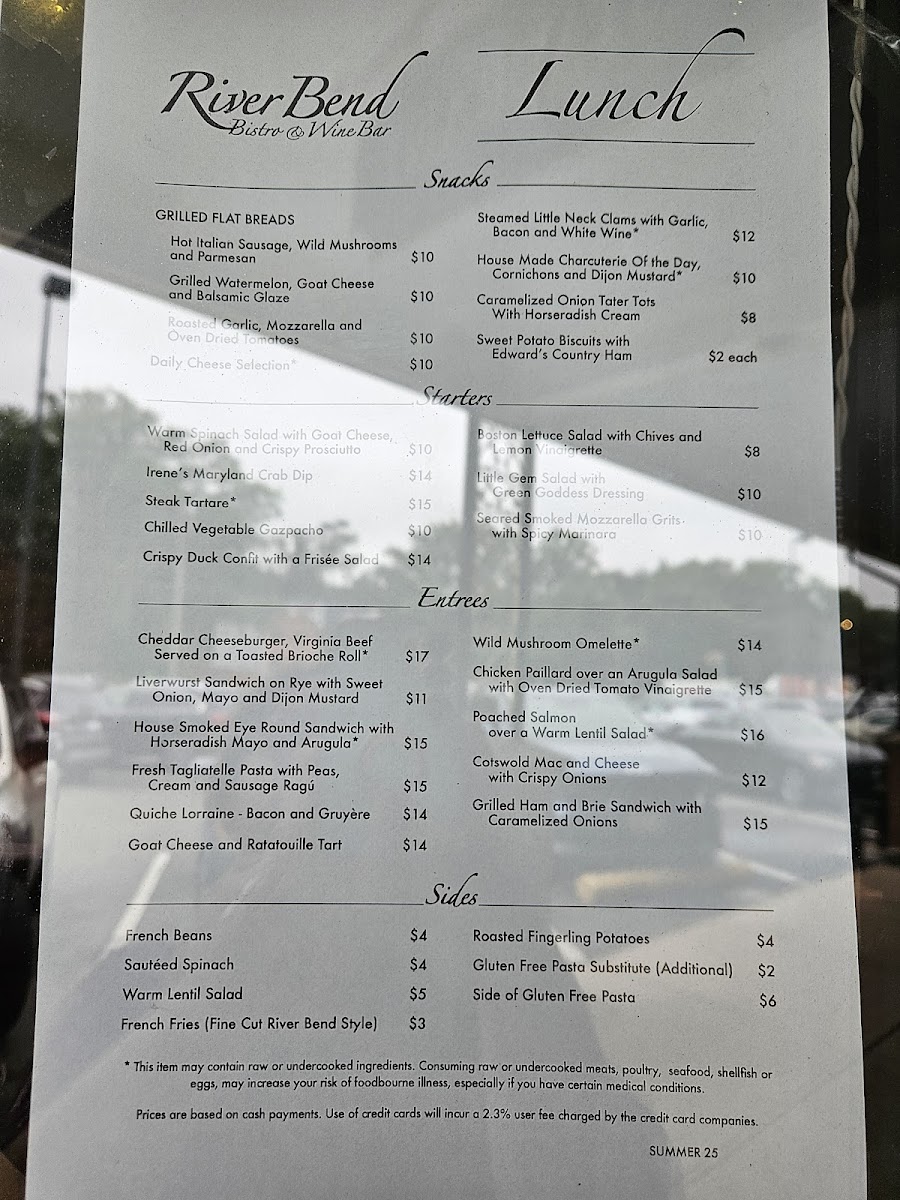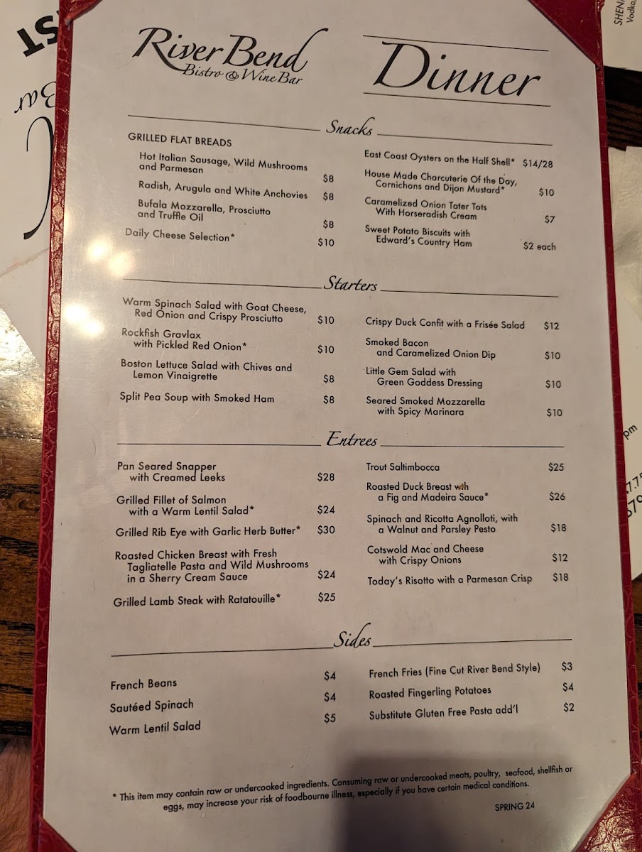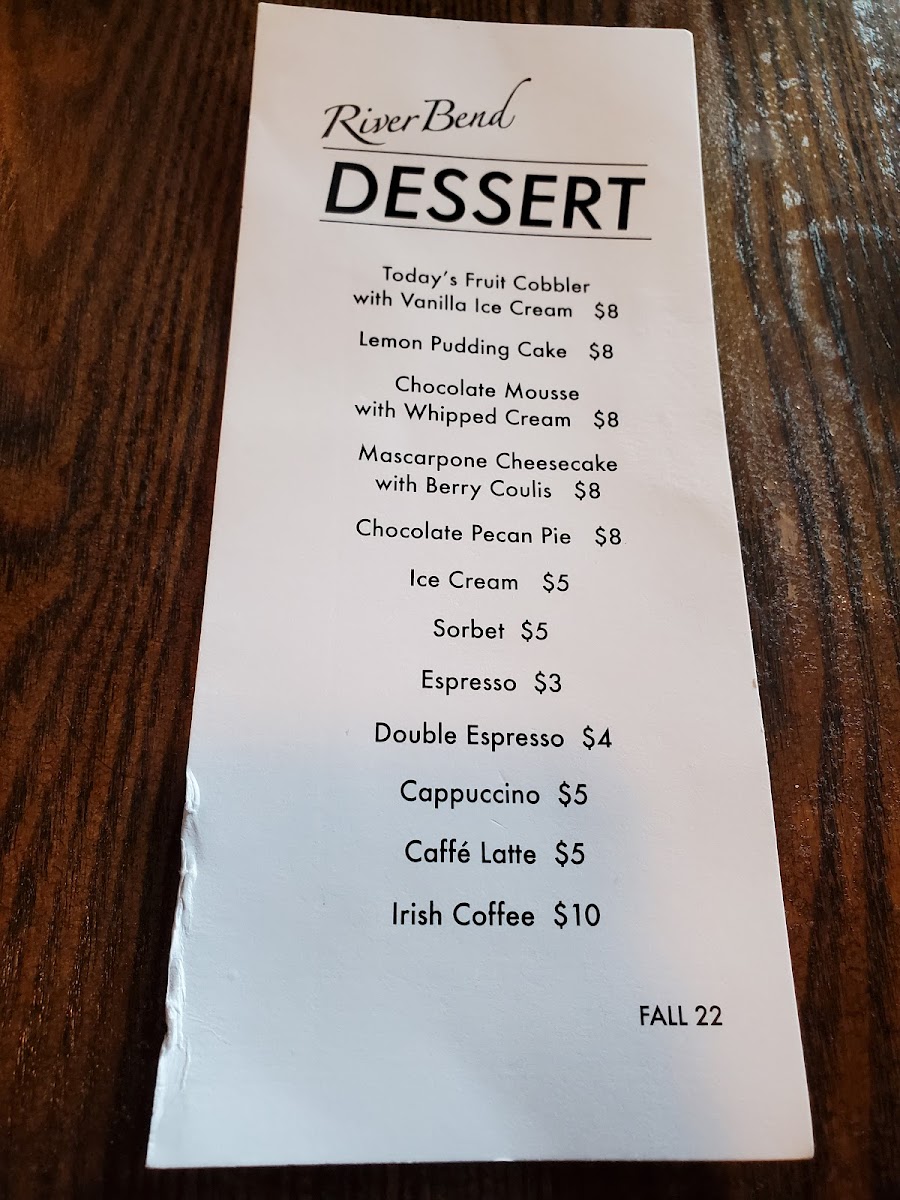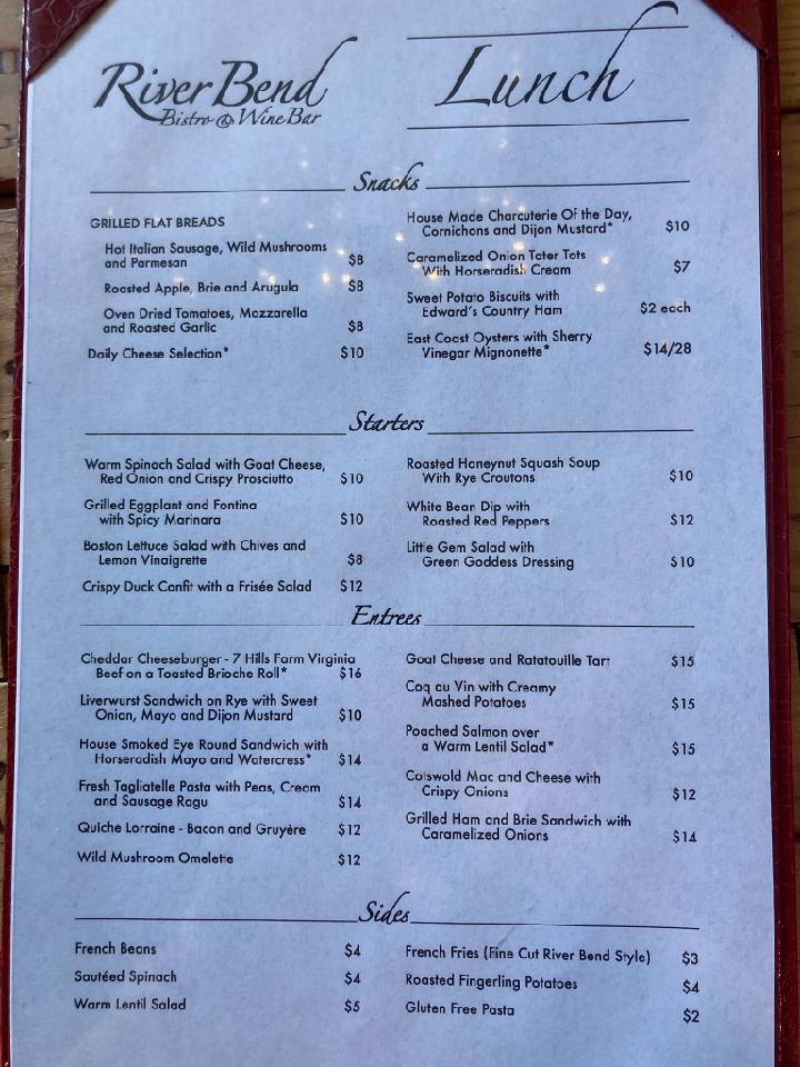 Overall, River Bend Bistro & Wine Bar's menu provides a well-rounded selection of dishes with something for everyone, from light bites to indulgent main courses. Whether you’re in the mood for fresh seafood, hearty comfort food, or a delicious burger, the menu offers high-quality ingredients and expertly prepared meals at a reasonable price.